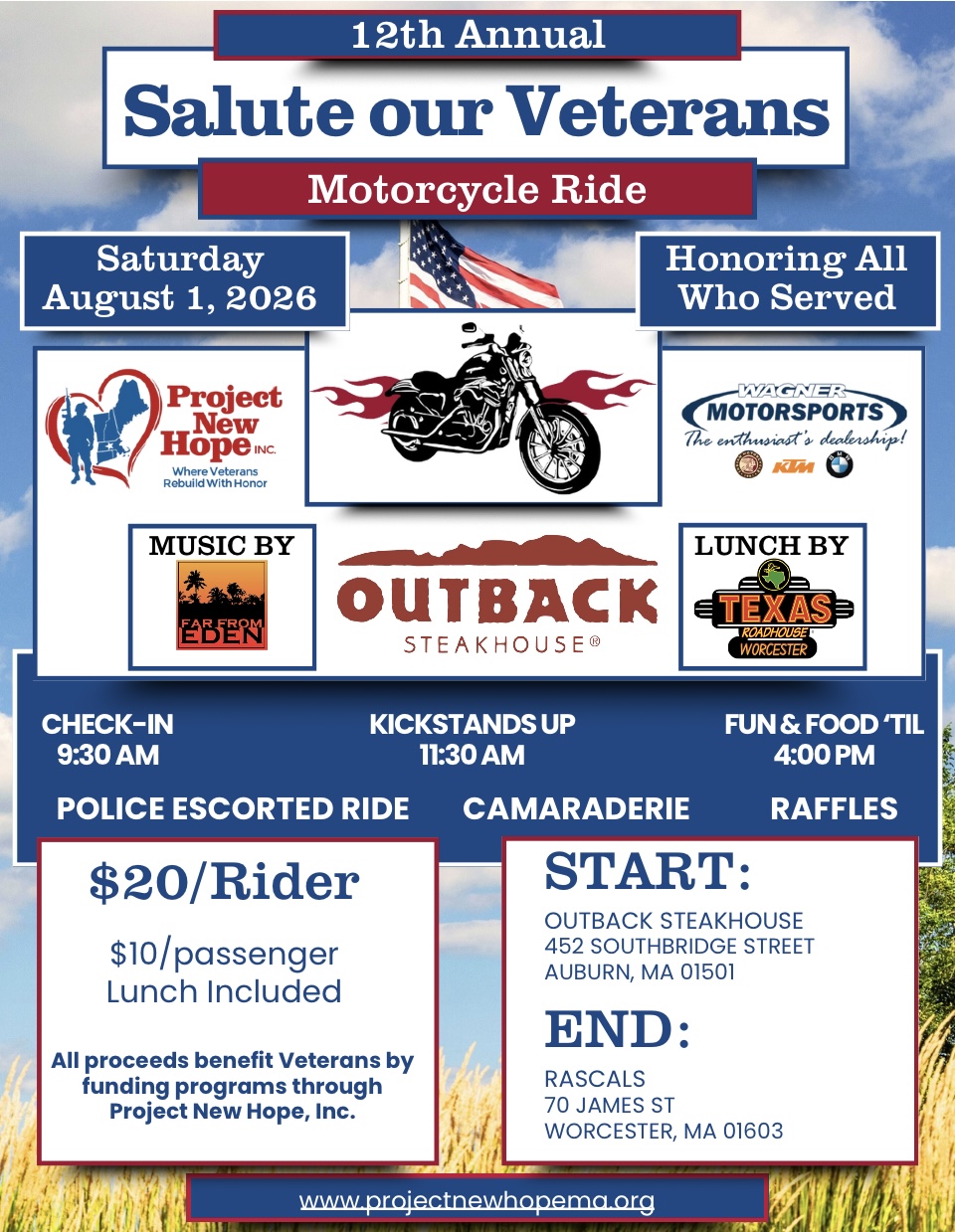 Click Here to Register SPONSORSHIP OPPORTUNITIES Join us for our 12th Annual “Salute Our Veterans” Motorcycle Ride on Saturday, August 1, 2026 Outback Steakhouse